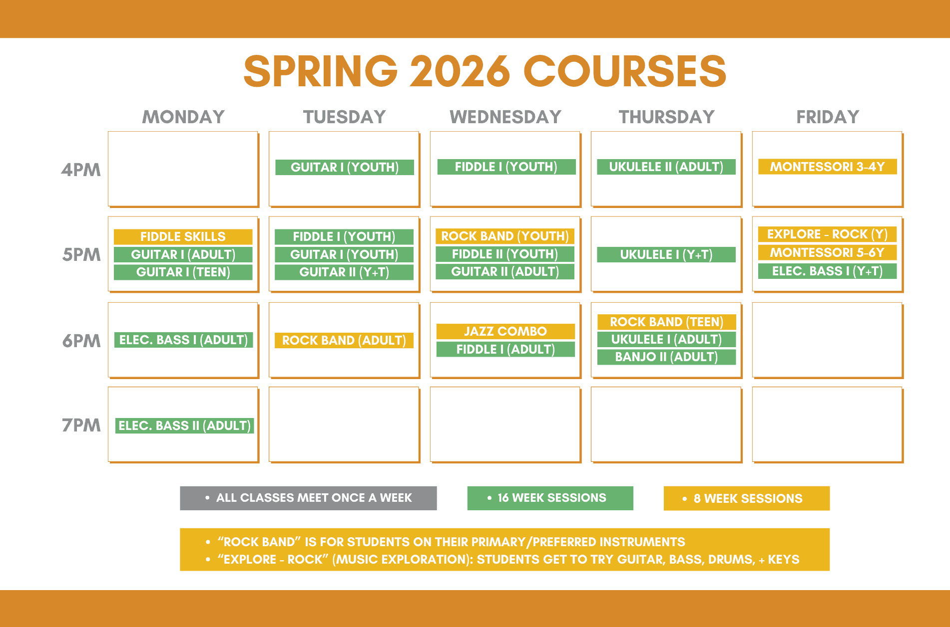 Certain special classes such as songwriting workshops and instrument skills classes occur in 8-week segments, which may be offered once or twice a semester. Here are our current offerings: